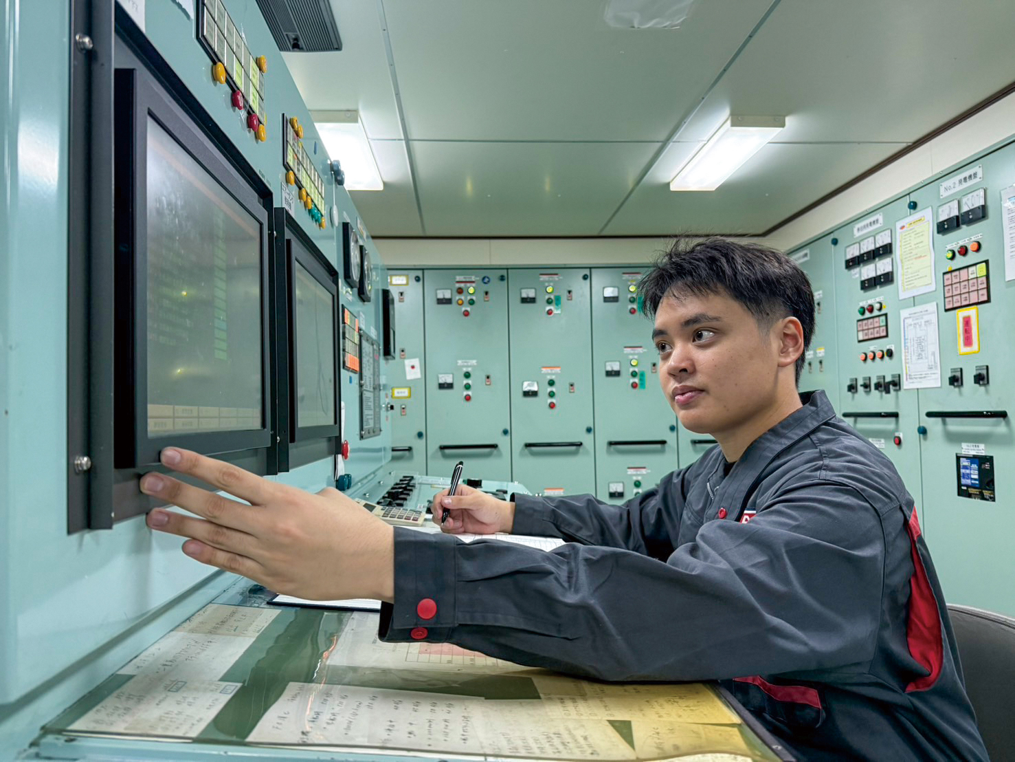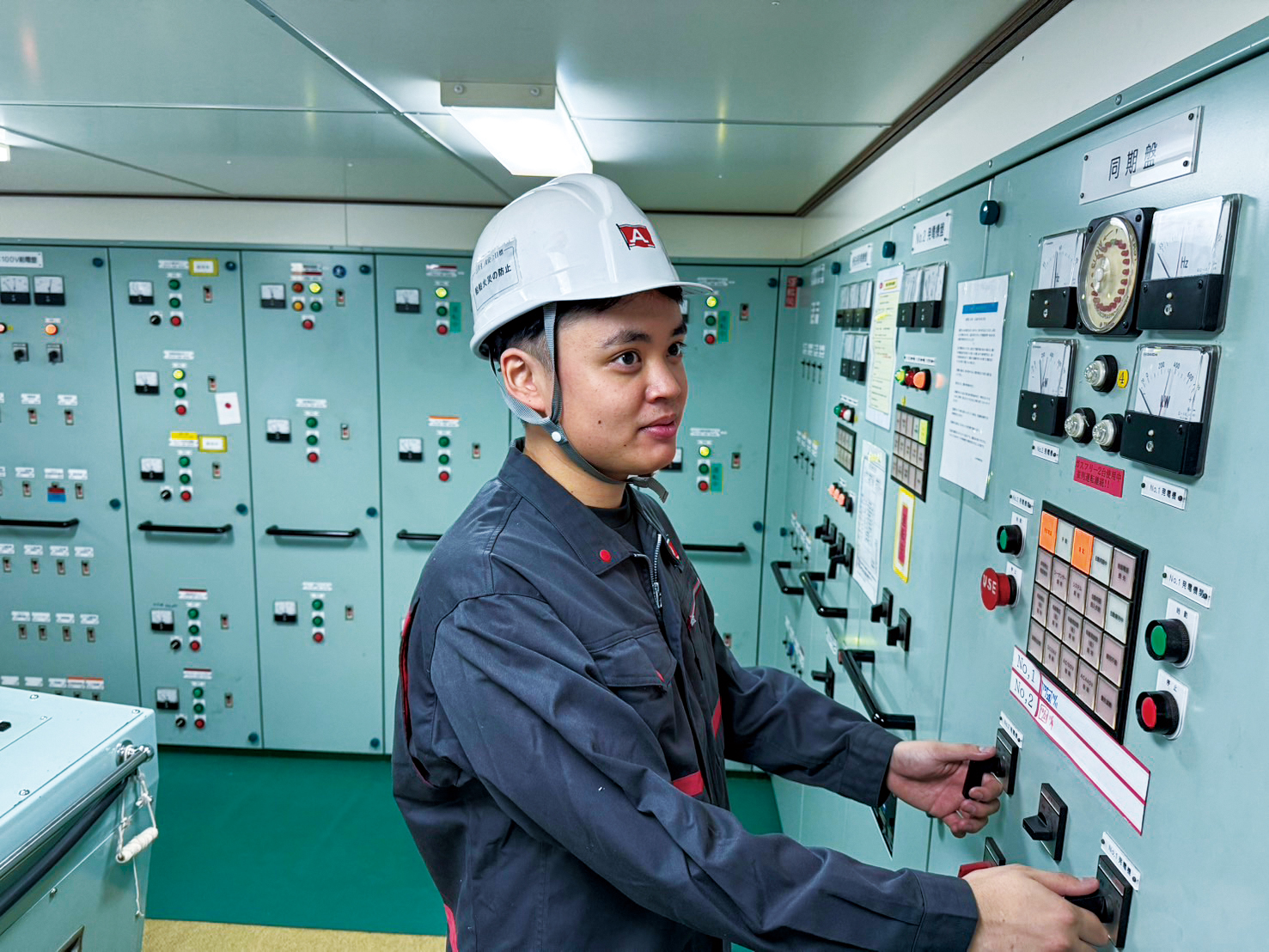 私は『第八十二英山丸』というタンカー船に乗っていて、主にエンジンやエアコン等のフィルター清掃や設備点検の仕事を行っています。船は常に動いているので万が一、油漏れや配管の異常で故障し、座礁してしまうなんてことになったら大変です。そうならないよう、決められた手順を当たり前に行うことを心がけ、事故につながらないよう気をつけています。